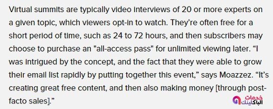 فهناك المدونون والمسوقون الرقميون الذين يجدون دخلا من ستة أرقام من مؤتمرات القمة الافتراضية ، ولكن قد تتساءل عما اذا كانت القمة الافتراضية هي نفس ما يحدث في البث الصوتي علي الانترنت . حسنا ، فيما يلي وصف واضح من صاحب المشروع .