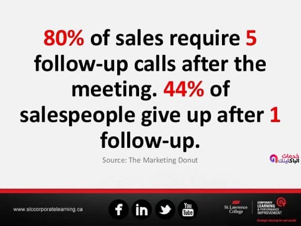 فالمتابعة وبناء العلاقات يكون أمر حيوي وجيد ، ووفقا لتسويق دونات “يتخلي 44 % من مندوبي المبيعات بعد متابعة واحدة ، ويغامر الشخص العادي بمحاولتين فقط للوصول الي احتمال المبيعات .