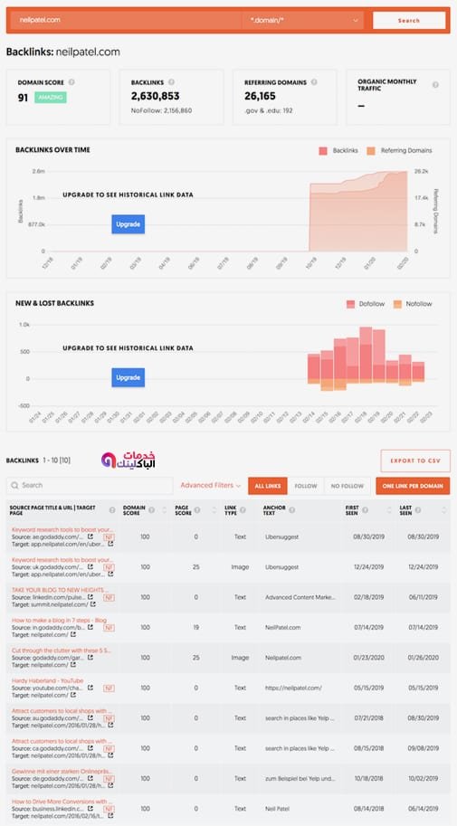 سوف يمكنك أن تجد مجموع عدد الروابط على الموقع، ومعدل النمو لكل رابط على مدار الوقت بالإضافة إلى شيء أكثر أهمية وهو قائمة بالمواقع الأخرى التي تضع Backlinks لمنشورات من الموقع المنافس الذي قمت بالبحث عنه.